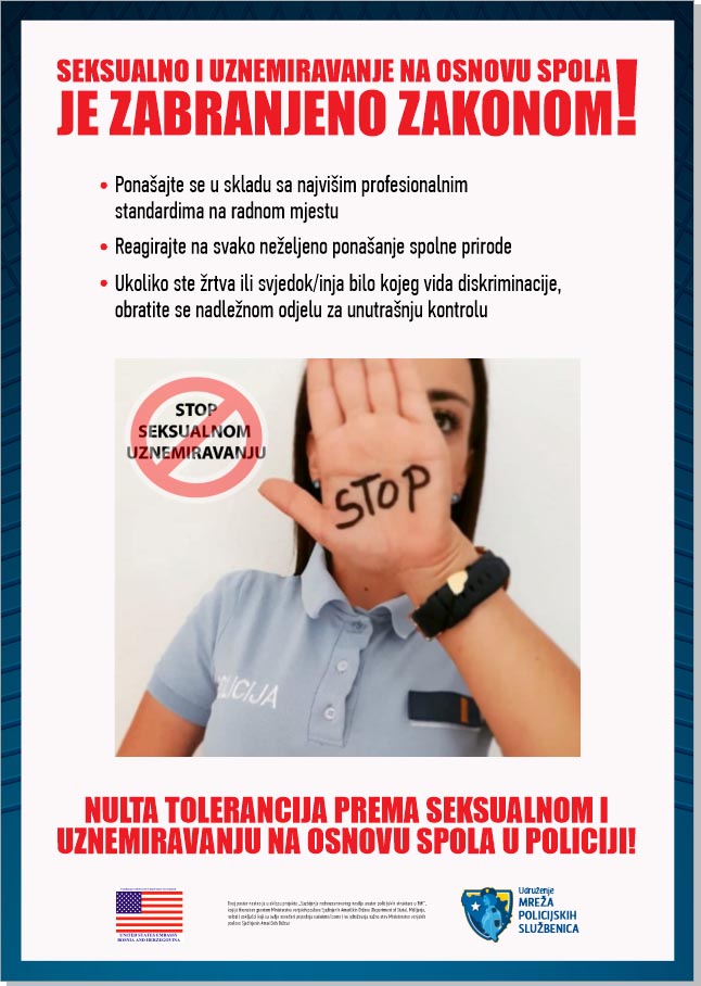 Kao završna aktivnost u okviru ovog projekta izrađeni su plakati koji šalju poruku o nultoj toleranicji prema seksualnom i uznemiravanju na osnovu spola u policijskim strukturama u Bosni i Hercegovini, koji su distribuirani policijskim agencijama i postavljeni na vidljiva mjesta. Cilj je podizanje svijesti o nultoj toleranciji prema seksualnom uznemiravanju i uznemiravanju na osnovu spola u policiji te podsticanje i ohrabrivanje zaposlenih da takve slučajeve prijavljuju. Distribucija navedenih plakata i postavljanje na vidljiva mjesta u policijskim organima jedna je od mjera koja će doprinijeti suzbijanju rodno zasnovanog nasilja u policiji što je i obaveza policijskih organa u skladu sa Zakonom o zabrani diskriminacije u BiH.
